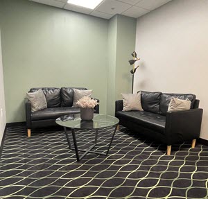 Medium size conference room with ground floor access, including a conference table that seats up to 6 guests, water, selection of games, and Audio Visual Capability. There are two single sofa couches located in the cubicles adjacent to the conference room and a lobby area with additional couches and chairs